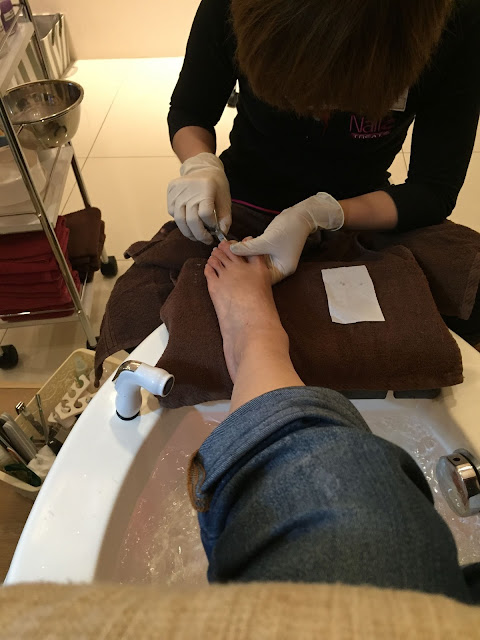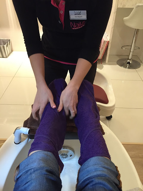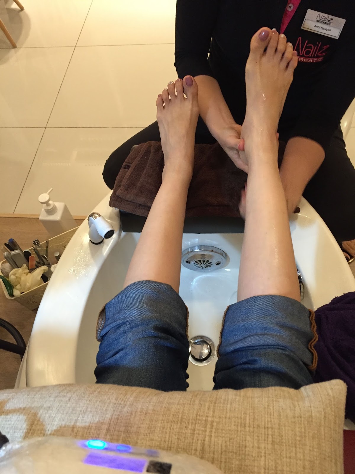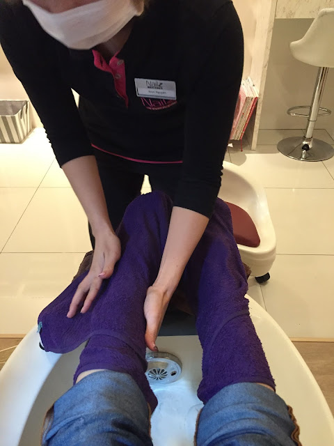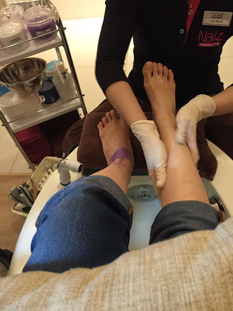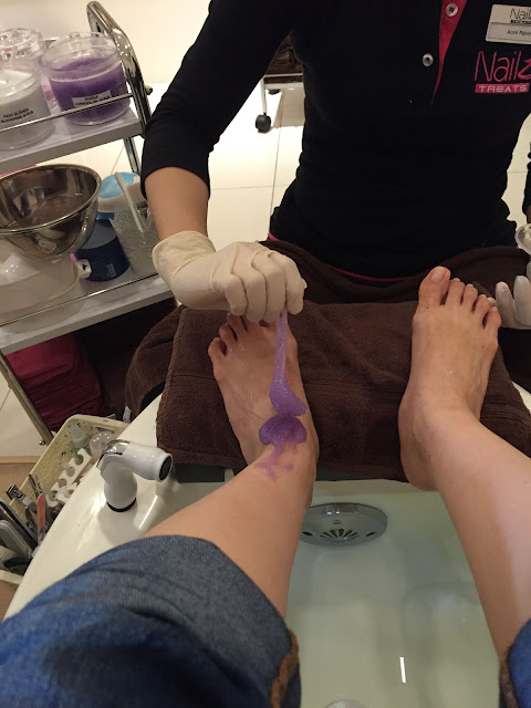 The other manicurist applied a lavender foot scrub to remove my dead skin cells on my legs.