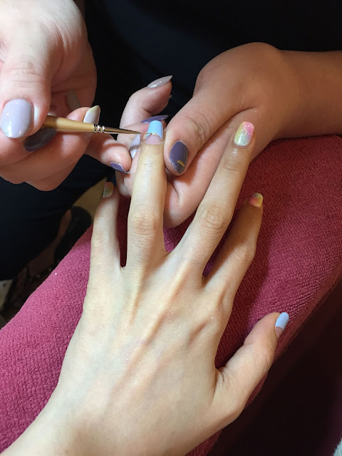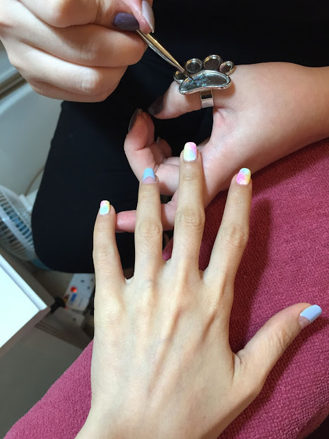 Once that was done, she proceeded to apply the gelish nail polish on certain fingers. I didn’t know what design to go for hence I told her to choose whatever she felt would suit me and she said, “let’s go for Spring/Summer colours!” I agreed since I love sweet colours from Spring/Summer season too.