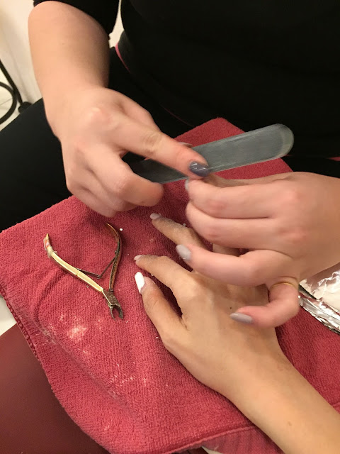 After the previous nail polish was removed, the manicurists proceeded to cut my nails shorter as per my request, filed them to the square shape which I liked and pushed the cuticles back before trimming the dead skin away.