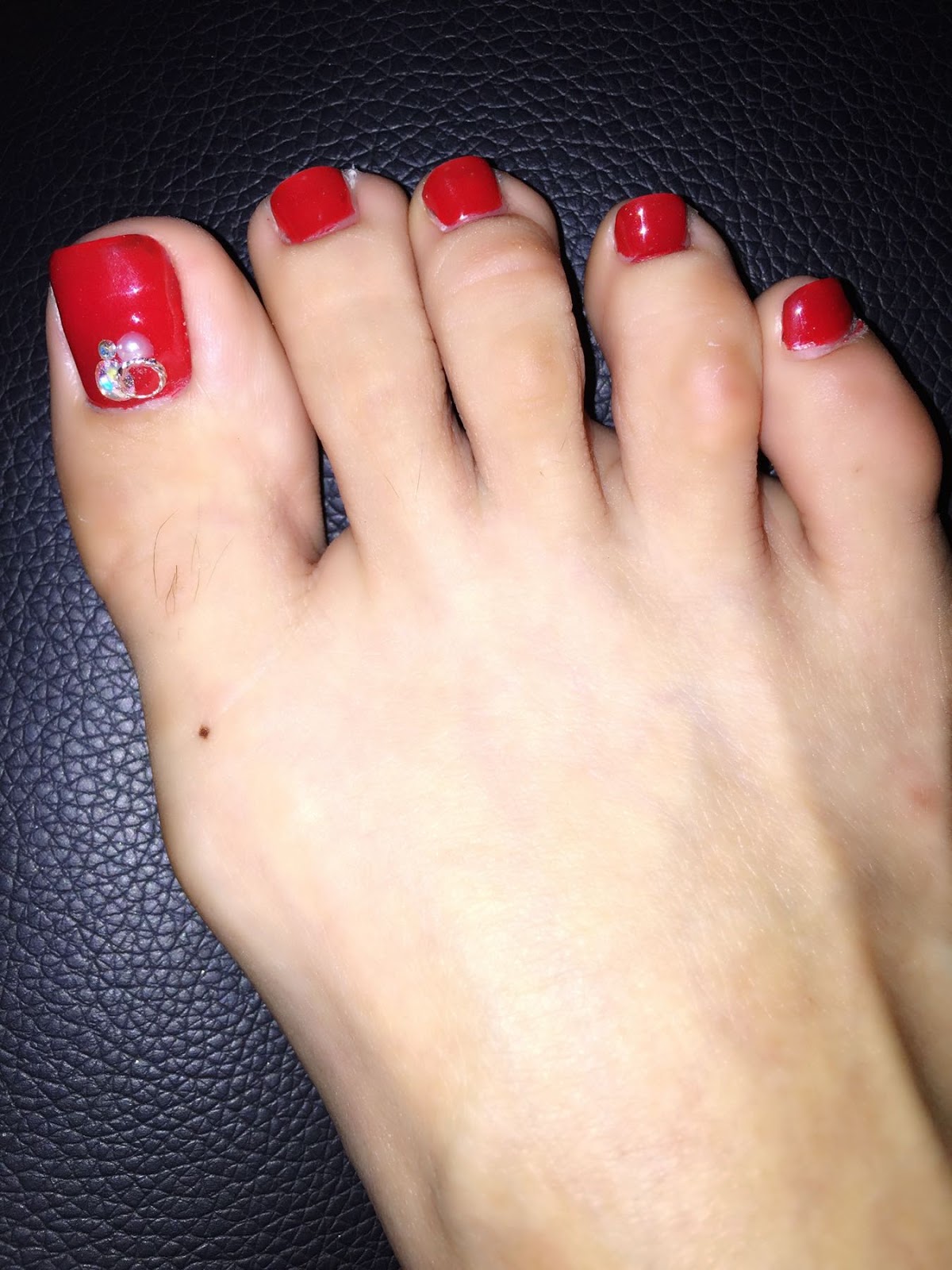As for my toenails, we decided to go for a sexy red nail color with just a bit of design on the big toe nail.